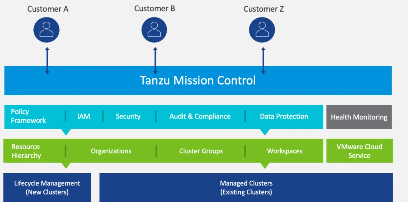 Take control of your Kubernetes environments at scale with Tanzu Mission Control—a unified platform designed to simplify the deployment, management, and governance of Kubernetes clusters across clouds and data centers. With Tanzu Mission Control, you can streamline your operations, enforce consistent policies, and ensure seamless security across all your Kubernetes clusters, no matter where they reside.